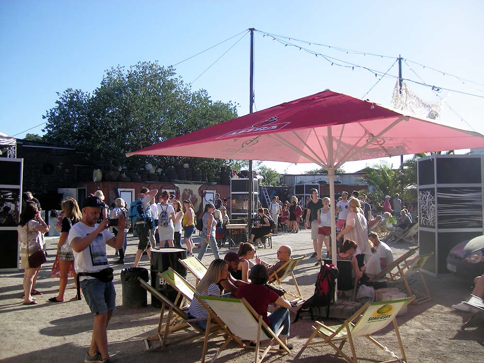 Auf der Außenbühne gab es Beats and Poetry. Der Vorplatz des JunkYard füllte sich am frühen Abend immer mehr. Die Gäste ließen sich in den aus alten Autoreifen selbst gebauten Sitzmöbeln im Freien nieder, genossen ein kaltes Getränk, lauschten dem Bühnenprogramm oder beteiligten sich an diversen Upcycling-Workshops.