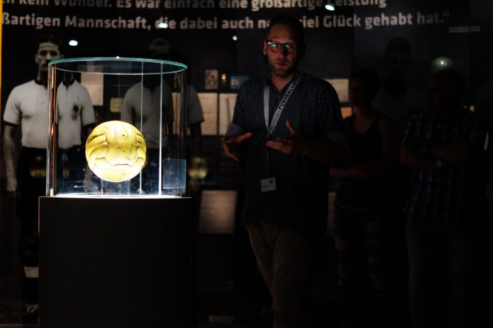„Im Erfolg ist es leicht Stolz zu sein“, prangt zurzeit in großen Lettern über dem Museum – eine Anspielung auf das Deutschland-Aus am vorherigen Mittwoch. Doch von Trauer spürte man am Museum wenig. Insgesamt waren rund 3000 Fußballfans während der Extraschicht zu Gast im Fußballmuseum.