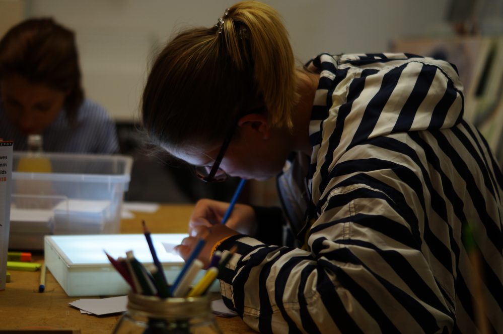 Nicht weit entfernt konnten die BesucherInnen im Depot in der Immermannstraße ihre Kreativität aufleben lassen. Im Rahmen der offenen Ateliers boten einige KünstlerInnen Workshops zum Erstellen eines Kaleidoskops oder Daumenkinos an.