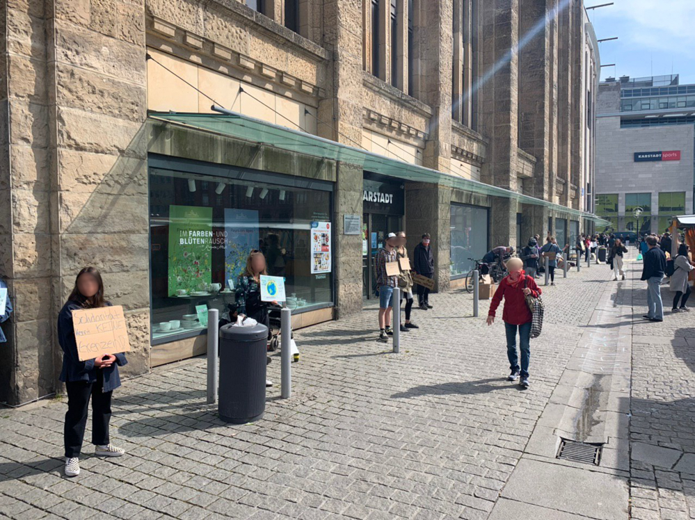 Ca. 25 Personen haben sich unter dem Motto „LeaveNoOneBehind“ vor einem Waffelstand auf dem Wochenmarkt angestellt. Ihr Ziel: Eine Waffel kaufen und in der Wartezeit auf ihre Forderungen aufmerksam machen. Dazu trugen sie Plakate mit Forderungen wie „Nicht wegschauen“ und „Rettet Menschen“ bei sich.