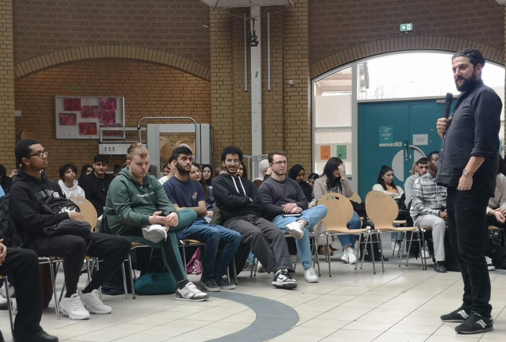 Die Schüler:innen ließen sich auch nicht von der Schulglocke oder den lärmenden Klassen auf dem Schulhof beirren. Dafür versuchte der prominente Gast sowohl während des Vortrags als auch im Anschluss alle Fragen der Schüler:innen zu beantworten.