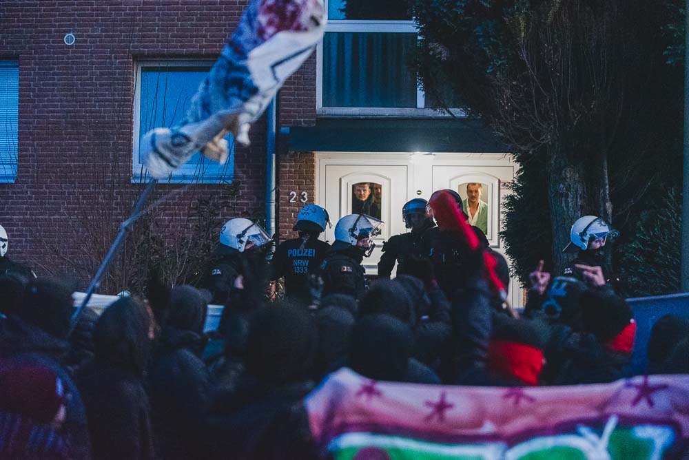 Dem Aufruf der „Autonomen Antifa 170“, gegen das Geheimtreffen zu protestieren, kamen laut Polizeischätzungen etwa 110 Personen nach. Der Protest verlief friedlich, Redebeiträge kritisierten das Vorgehen der anwesenden Polizeikräfte, das den linken Protest kriminalisiere: „Die Polizei filmt hier und nicht da, wo der rechte Umsturz geplant wird.“ Kim Schmidt, Pressesprecherin der „Autonomen Antifa 170″, ordnet den Ort des Treffens ein: „Das Büro von Matthias Helferich ist aktuell der Dreh- und Angelpunkt rechter Bestrebungen in Dortmund – es gehört dicht gemacht!“