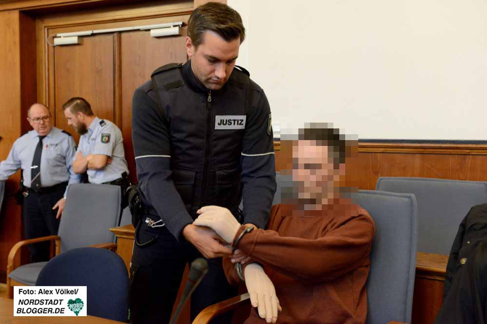 Der Angeklagte, der derzeit im Justizvollzugskrankenhaus in Fröndenberg behandelt wird, wird in Handschellen von einem Wachmeister in den voll besetzten Anhörungssaal geführt. Dabei zeigt sich an seinen Kompressionshandschuhen, dass auch er Schäden von der Explosion davon getragen hat.