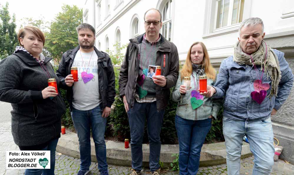 Eine Stunde vor Prozessbeginn erinnern die Freunde an die getötete Dortmunderin. Mit Kerzen und Herzen, die Karin E.s Namen tragen, stehen sie vor dem Landgericht und verfolgen später erschüttert den Prozessbeginn.