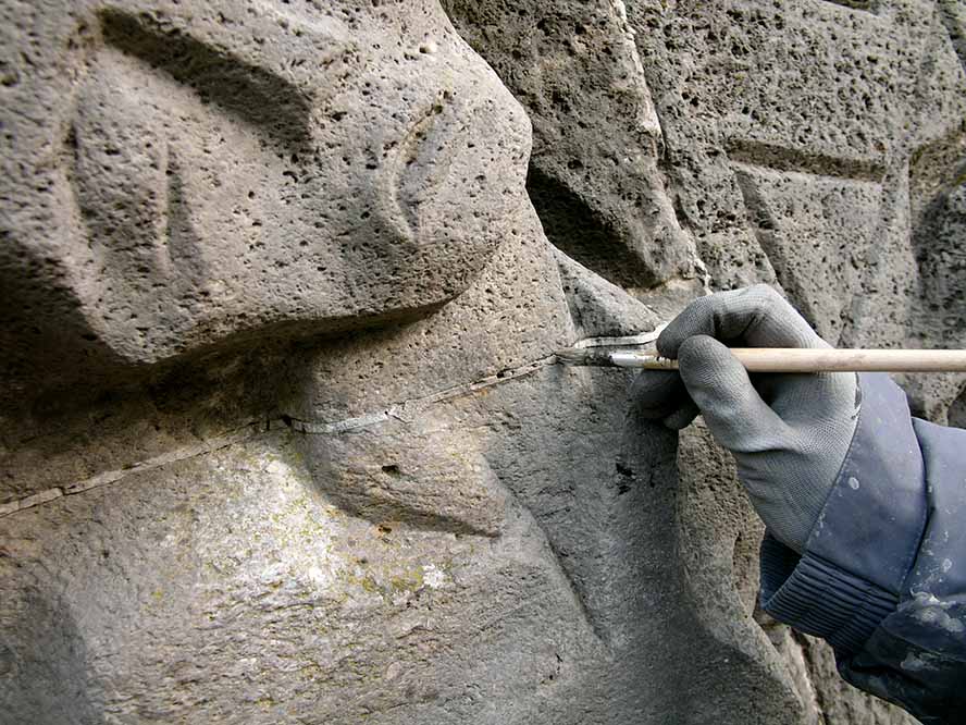 Zunächst wurde das gesamte Objekt mit Heißdampf gereinigt. Danach zeigten sich im Reliefbereich feine Moosanhaftungen, die mit einer Druckluftdüse entfernt wurden. Kalkaussinterungen wurden mit dem Mikrosandstrahlgerät soweit reduziert, dass mit Silikatretuschen ein Angleichen an die Umgebung möglich war.