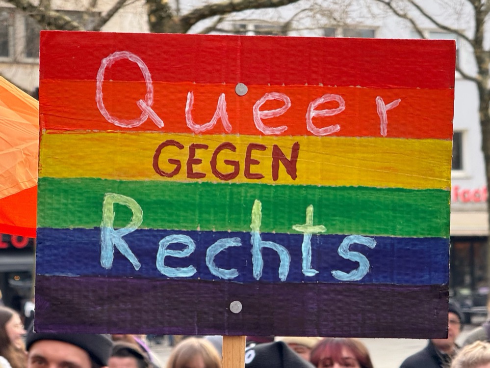 „Wählt Demokratie und Vielfalt. Die Bedrohung queerer Rechte kommt aus rechtspopulistischen Kreisen. Wir fordern Menschenrechte für alle, unabhängig von sexueller Orientierung oder Geschlechtsidentität“, ergänzte Georg Deventer vom Arbeitskreis gegen Rechtsextremismus.