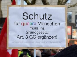 Und wir brauchen ein Grundgesetz, das queere Menschen wirksam schützt, vor denen, die unsere Rechte offen infrage stellen. Wir begehen in diesem Jahr, in zwölf Wochen, das Ende des Zweiten Weltkriegs und das Ende des Faschismus in Deutschland. 80 Jahre ist das her. Und nach 80 Jahren stehen queere Menschen, stehen Schwule, Lesben und trans* Personen als einzige Gruppe der von den Nazis verfolgten und ermordeten Menschen immer noch ohne einen expliziten Schutz durch das Grundgesetz da. Die Aufforderung geht an alle Parteien: Erweitert den Artikel 3 des Grundgesetzes und schützt endlich Menschen vor Diskriminierung und Verfolgung aufgrund ihrer sexuellen Orientierung und ihrer Geschlechtsidentität!