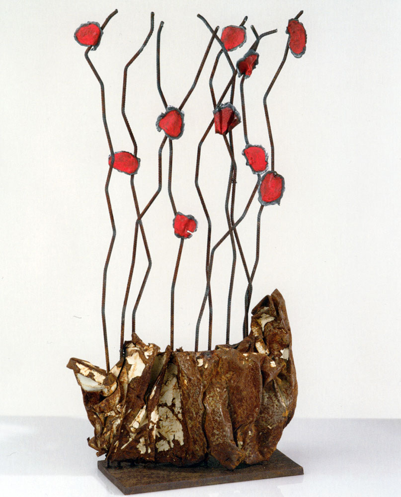 Sie experimentiert mit dem Material. Trägt dicke Farbschichten auf. „Manche Bilder sind richtig schwer“, sagt sie und zeigt auf ein Werk. Anderes wirkt leicht fast ätherisch, flüchtig. Vergänglichkeit ist ihr Thema. Motive aus der Natur, bilden den Ausgangspunkt für ihr Schaffen, so auch für ihre Plastiken. Nester sind da zu sehen. Gebrauchtes abgelegtes Material, hier Drähte, Späne und Bänder aus Metall werden verwoben. Und es wächst etwas neues daraus. „In der Skulptur bin ich noch freier als in der Malerei“, beschreibt sie ihre stetigen Fortschritt.