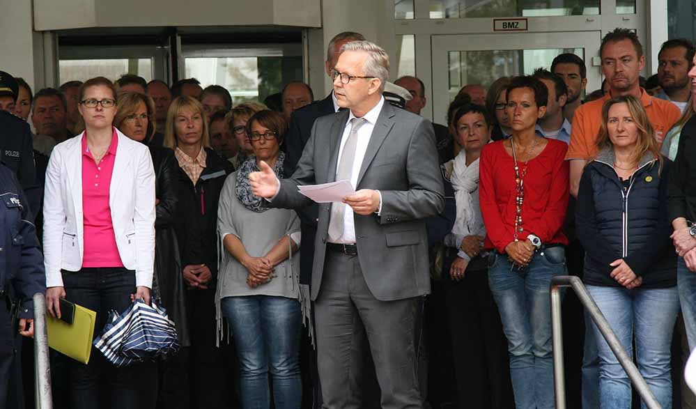 Am Montag fand dann ein Gedenken vor dem Polizeipräsidium statt. Polizeipräsident Gregor Lange lud die Mitarbeiter des Polizeipräsidiums Dortmund zu einer Gedenkminute zu Ehren der getöteten Kollegen ein.