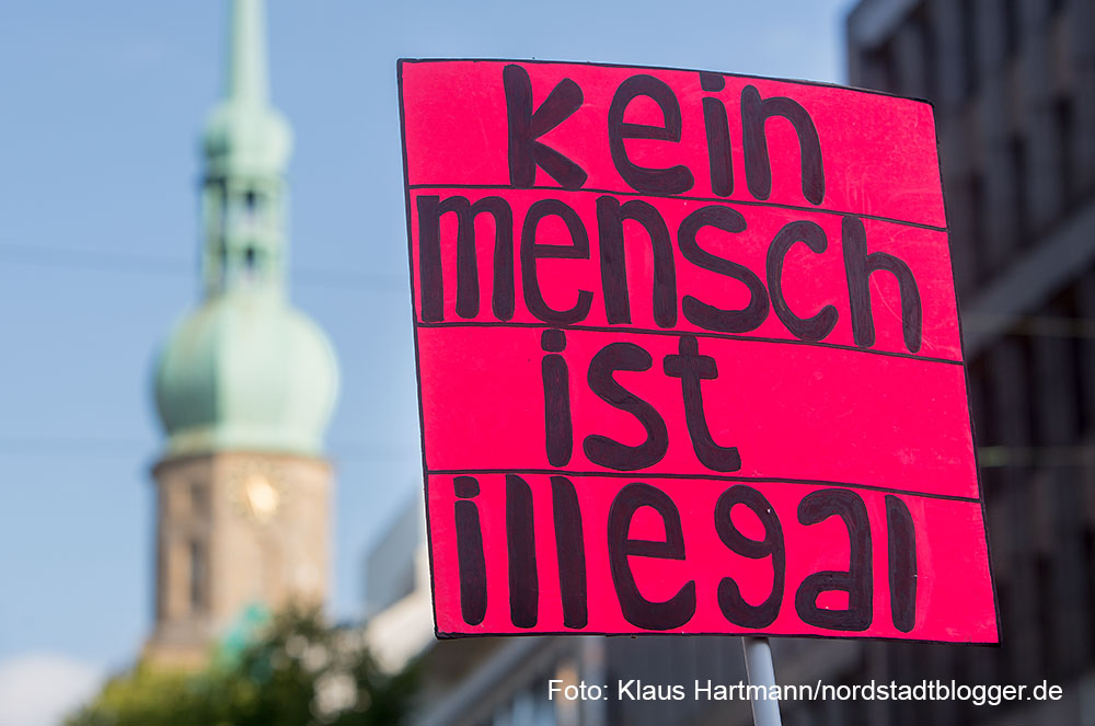 „Say it loud, say it clear, refugees are welcome here!“, dieser Ruf, der in den letzten Wochen so oft durch den Dortmunder Hauptbahnhof schallte, war am Samstag laut in der Innenstadt zu hören. Unter dem Motto „Solidarität mit ALLEN Geflüchteten“ zogen etwa 450 Menschen vom Nordausgang des Hauptbahnhofs zum Hansamarkt.