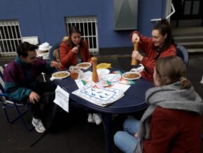 Auf unserem Weg kommen wir an ganz unterschiedlichen Ständen vorbei. Manche in riesigen Innenhöfen, zu manchen kommt man nur durch eine Spinnenweben- verhängte Gasse. Und ein Team hat es sich besonders leicht gemacht. „Wir hatten keine Lust, unten alles sauberzumachen. Da liegt noch so viel Efeu rum“, erzählt mir eine der BewohnerInnen. „Also dachten wir, warum nicht einfach bei uns in der Küche? Das Wetter soll ja eh nicht so gut werden und dann müssen wir nicht so viel schleppen.“