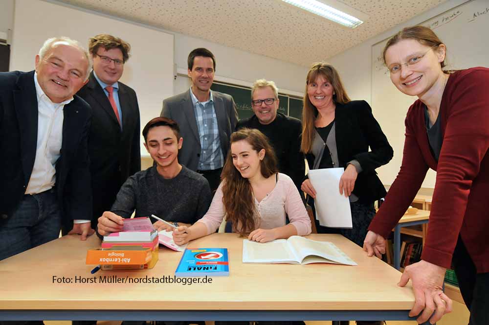 Schüler helfen Schülern - und der Rotary-Club Dortmund Hörde hilft mit. Für das Nachhilfe-Projekt des Helmholtz-Gymnasiums, der Gertrud-Bäumer-Realschule und der Albrecht-Brinkmann-Grundschule, bisher mit Mitteln des Programms "Soziale Stadt - Dortmund Nordstadt" gefördert, sagten Ubbo De Boer und Johann Jaeger (1. u. 2. v.l) die Finanzierung für die nächsten zwei Jahre zu. Dr. Dirk Bennhardt (Helmholtz-Gymnasium), Bernd Weiermann und Uta Wittig-Flick (Stadterneuerung Nordstadt) sowie Projektleiterin Kerstin Kiehl (Helmholtz-Gymnasium) schauten Ardit und Serafina veim "Büffeln" über die Schulter.
