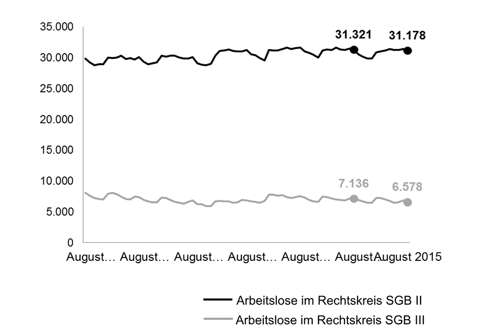 Einen Rückgang der Arbeitslosigkeit verzeichnen beide Rechtskreise. Im Bereich der Arbeitslosenversicherung (Agentur für Arbeit, SGB III) sank die Arbeitslosigkeit im Vergleich zum Juli 2015 um 265 Personen oder 3,9 Prozent auf aktuell 6.578 Personen. Im Vorjahresvergleich liegt die aktuelle Arbeitslosigkeit im Versicherungsbereich um 558 Personen oder 7,8 Prozent niedriger.