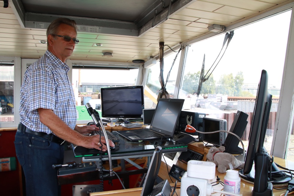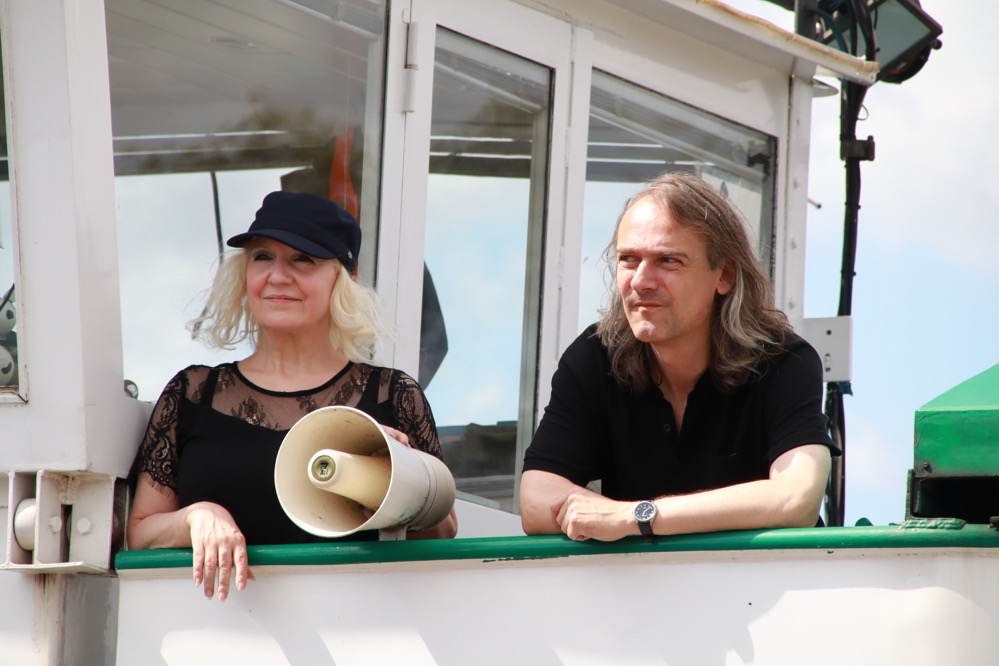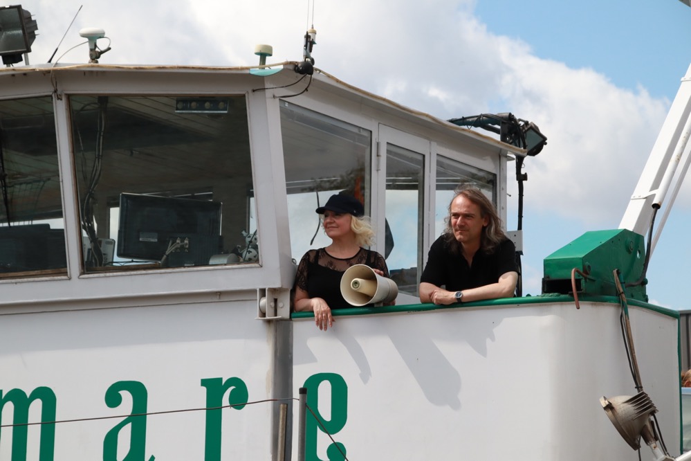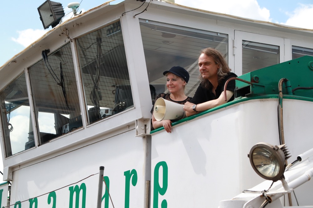 Schiffseigner Eberhard Butenhof und Steuerfrau Kerstin Weiß leben in Dortmund und sind froh und stolz, Teil dieses einzigartigen Kunstwerks zu sein. Ihre Reise führt nun zunächst vom Dortmunder Hafen entlang des Dortmund-Ems-Kanals zur Schleuse Henrichenburg und von da weiter über den Rhein-Herne-Kanal bis nach Oberhausen. Ein 1000-Watt-Lautsprecher wird von Bord aus die Schallfest-Kompositionen an die Ufer der Region und darüber hinaus transportieren.