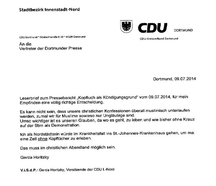 „Sie hat neun Jahre kein Kopftuch getragen. Das war in ihrem Arbeitsvertrag auch so geregelt. Und dann kommt sie plötzlich mit einem Kopftuch – ohne Rücksprache. Das ist eine Unverschämtheit“, erneuert sie ihre Kritik im Gespräch mit nordstadtblogger.de. Allerdings – und das macht sie mehrfach deutlich – habe sie als Privatperson und Nordstädterin geschrieben. „Leider Gottes auf CDU-Papier. Das war der größte Fehler“, zeigt sie sich selbstkritisch.