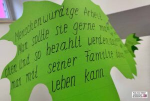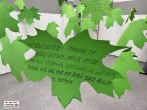 Beraterin Beata Gilge spricht von einem „Wald der Stimmen“, der in der Ausstellung gewachsen ist. Besucher*innen konnten dort aufschreiben, was für sie menschenwürdige Arbeit bedeutet. Ihre Antworten sind ehrlich, oft schonungslos – und erzählen von Wünschen, die so schlicht wie grundlegend sind.