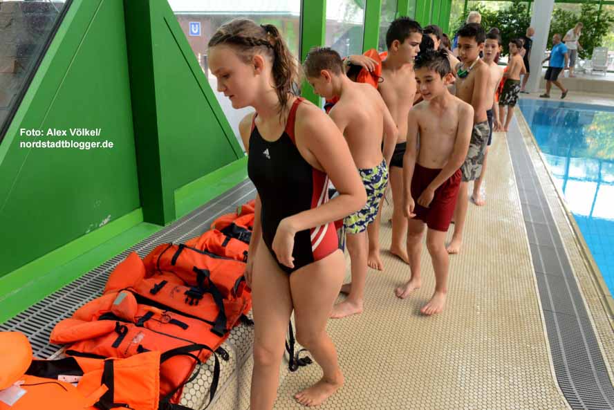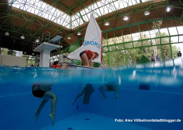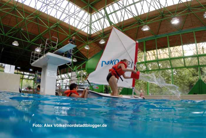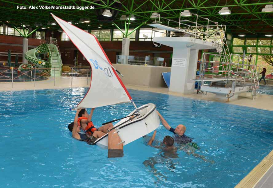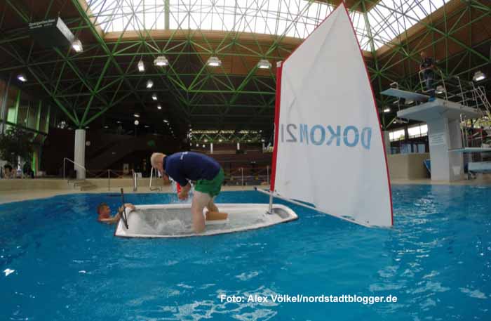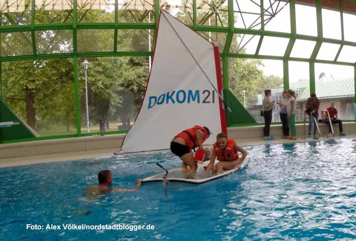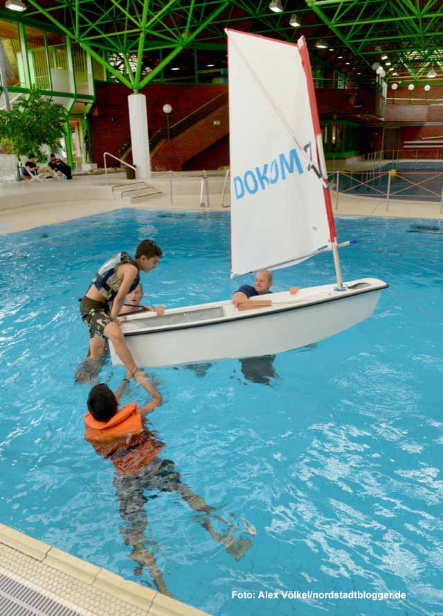 Bevor es auf den Phoenix-See ging, starteten die Hauptschüler ihre Segelwoche am Montag im Nordbad. Mit einem Kindersegelboot, einem so genannten Optimisten, lernten sie unter anderem das richtige Verhalten beim Kentern sowie weitere Grundkenntnisse.