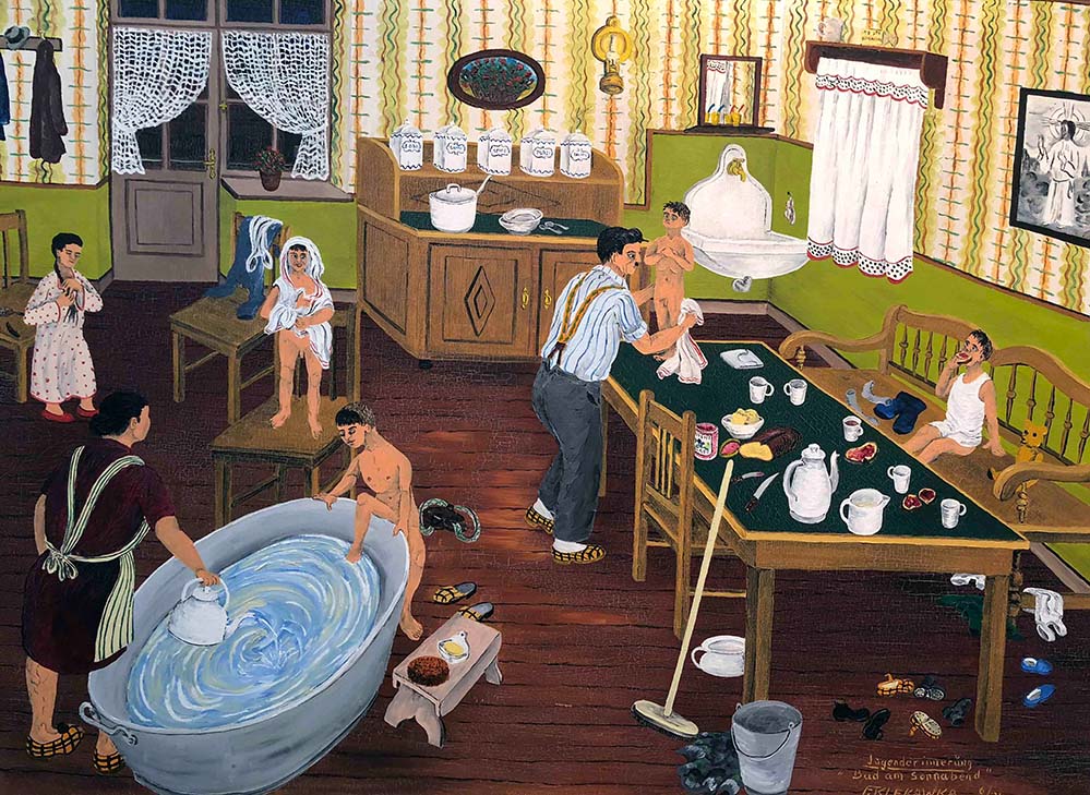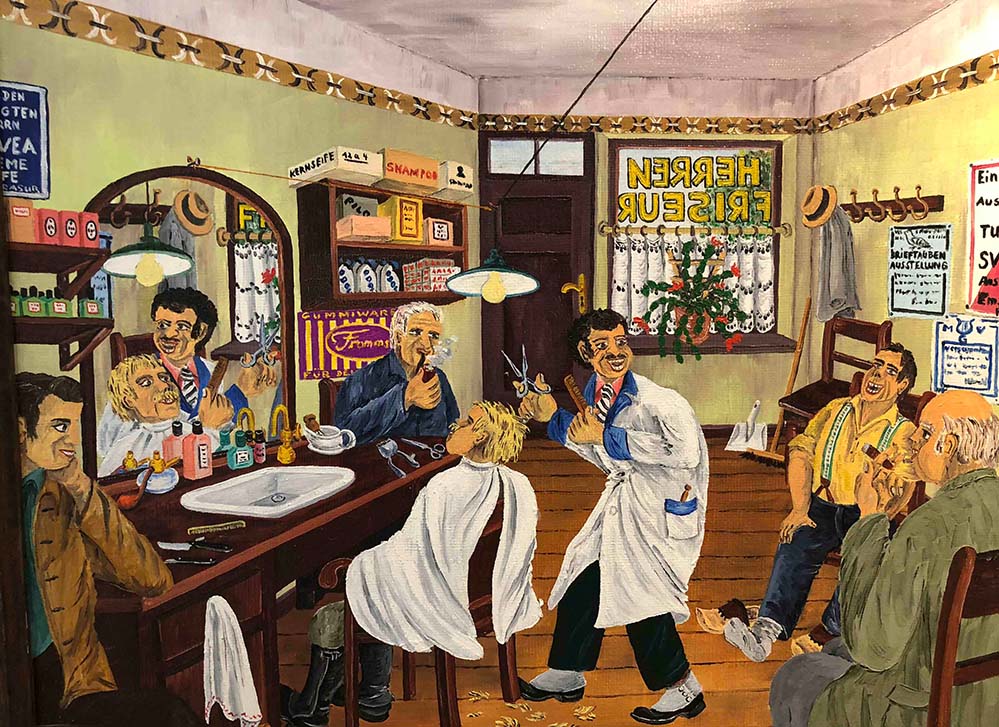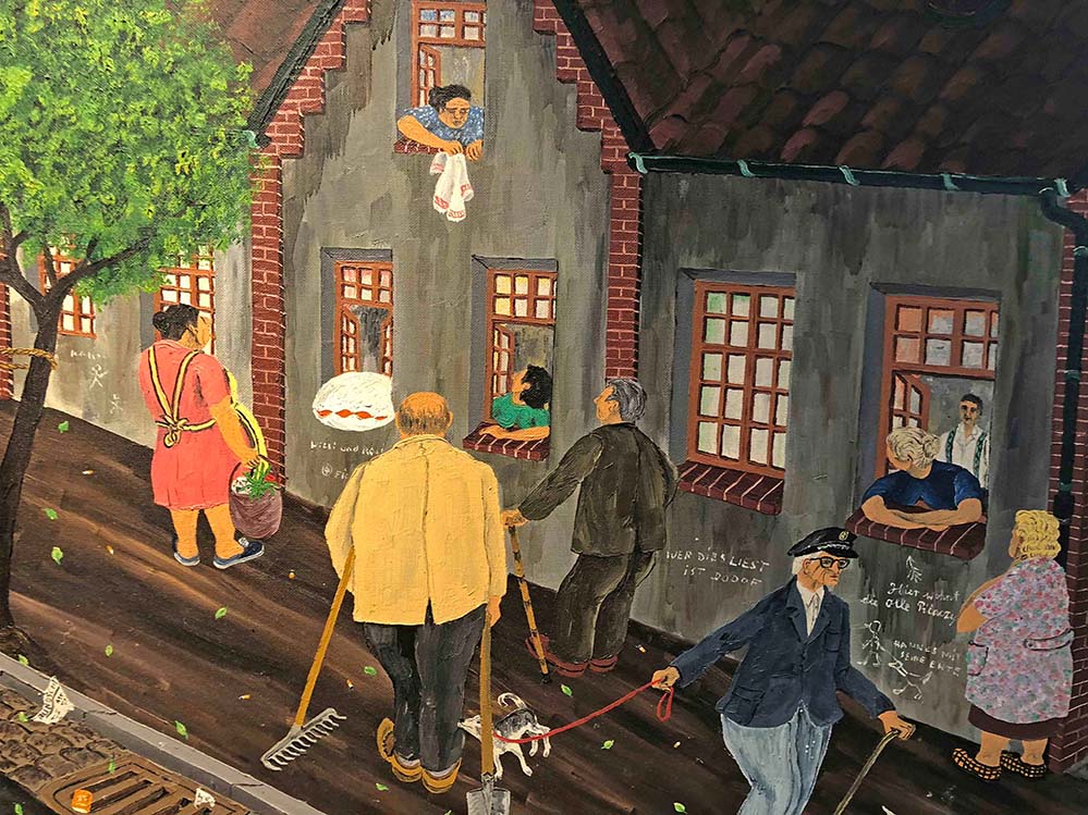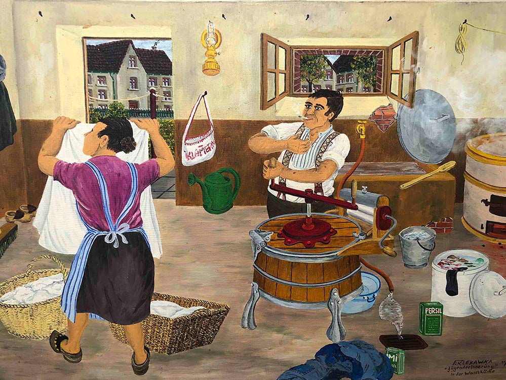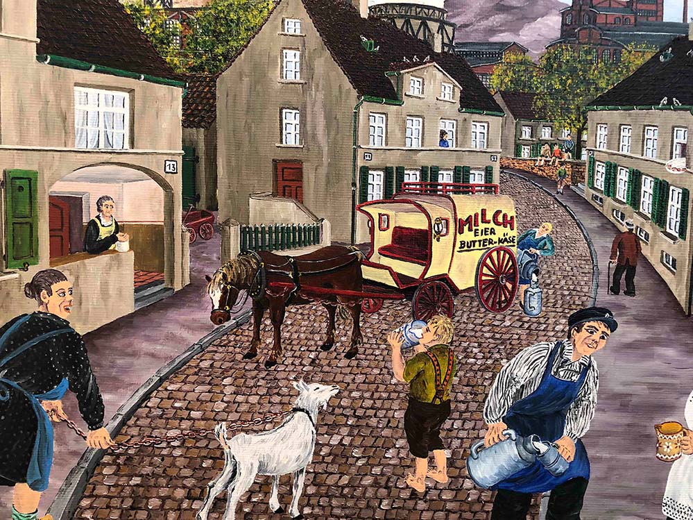 Menschen mitten im Alltagsleben. Beim Friseur, wenn der Milchmann kommt, beim samstäglichen familiären Badespaß in der großen Küche oder vor und in der Eckkneipe oder im Hinterhof. Sein detailgetreues Malen – selbst der Pinkelpott fehlte nicht – macht Spaß. Bei älteren Besuchern werden manche Erinnerungen wach, Jüngeren kann erklärt werden, wie es denn damals eigentlich so war.