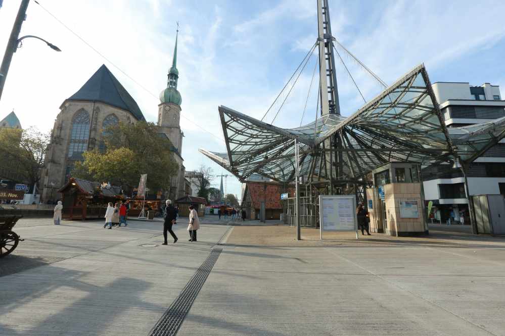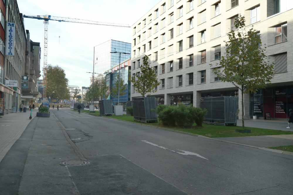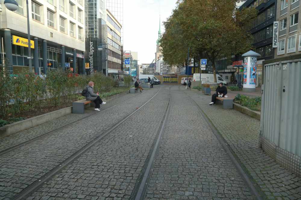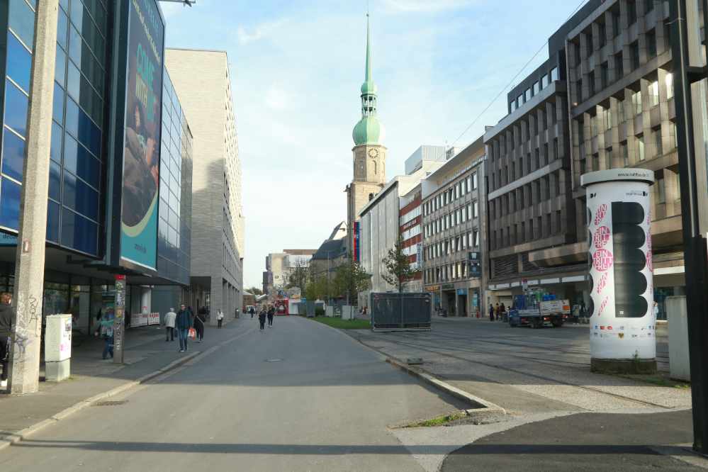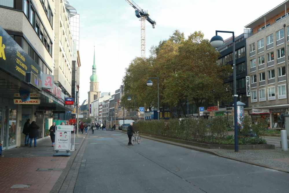 Und hier wird es schwierig: Was soll, was wird sich ansiedeln an Stelle der brachgefallenen Geschäfte ? Welche Art der Neubelebung soll man forcieren? Wie geht man um mit endlosen langweiligen Fassaden wie sie sich auf der Südseite zwischen Reinoldikirche und der Einmündung Hansastraße hinziehen?
