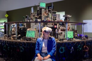 „TC-2000“ von Akwasi Bediako Afrane ist eine dystopisch erscheinende Stadtlandschaft aus Dortmunder Elektroschrott, die mit dem Kurator:innen-Team gemeinsam entwickelt wurde. Wer im Sessel Platz nimmt und die VR-Brille aufsetzt, kann virtuell tiefer in die Installation eintauchen.
