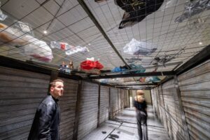 Im Nachbarsaal laufen Besucher:innen dann durch einen von einem Drahtgeflecht überdachten Gang. Abfallstücke auf dem Geflecht werfen ihre Schatten auf die Personen darunter. Die Arbeit ist bereits von 2015 und bezieht sich auf eine konkrete Situation in Hebron im Westjordanland. Die palästinensische Bevölkerung schützt sich mit Netzen vor dem Müll aus den höher gelegenen israelischen Siedlungen: „Los de Arriba y Los de Abajo“, übersetzt „Die von oben und die von unten“, nennt Künstler Kader Attia das Werk.