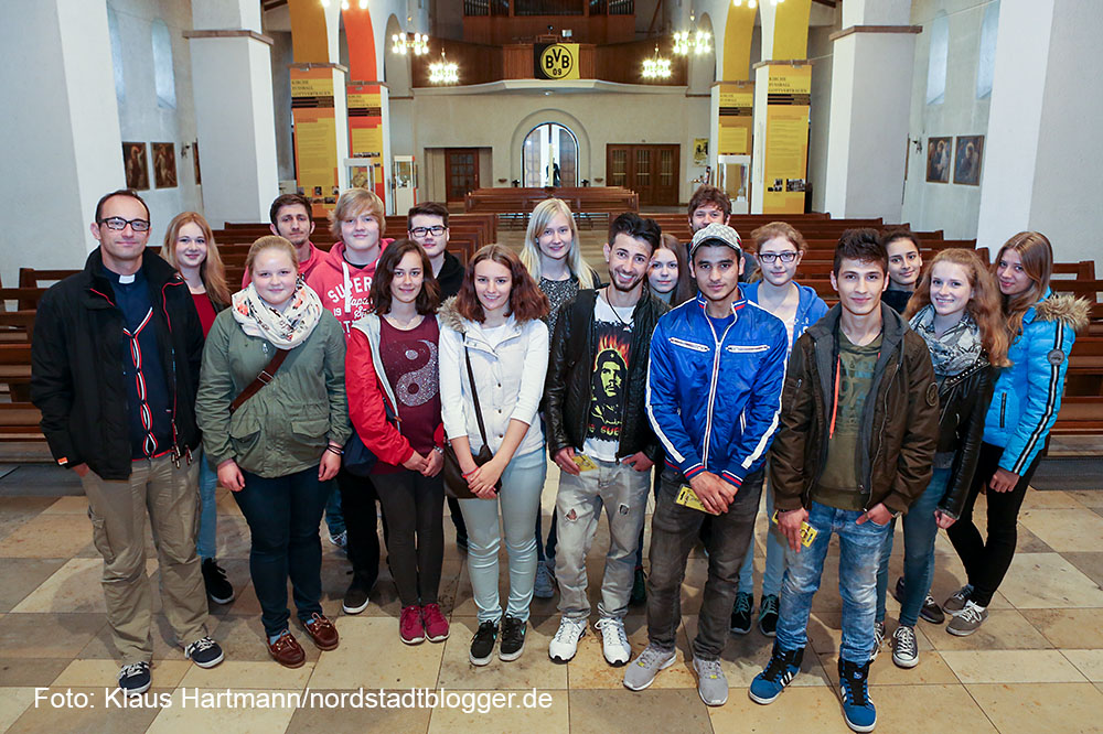 Fußball ist immer ein Thema für Männer, so auch für die Jugendlichen aus Syrien und dem Irak, die sich im Flüchtlingscafé an der Gertrudiskirche treffen. Erst war ein gemeinsamer Besuch des Westfalenstadions geplant, aber dort war eine Führung wegen der Kürze der Vorbereitungszeit nicht mehr möglich. So hatte Schwarzmann die Idee, die Borussiakirche zu besichtigen, die Kirche der Gemeinde, aus der der BVB hervorgegangen ist.