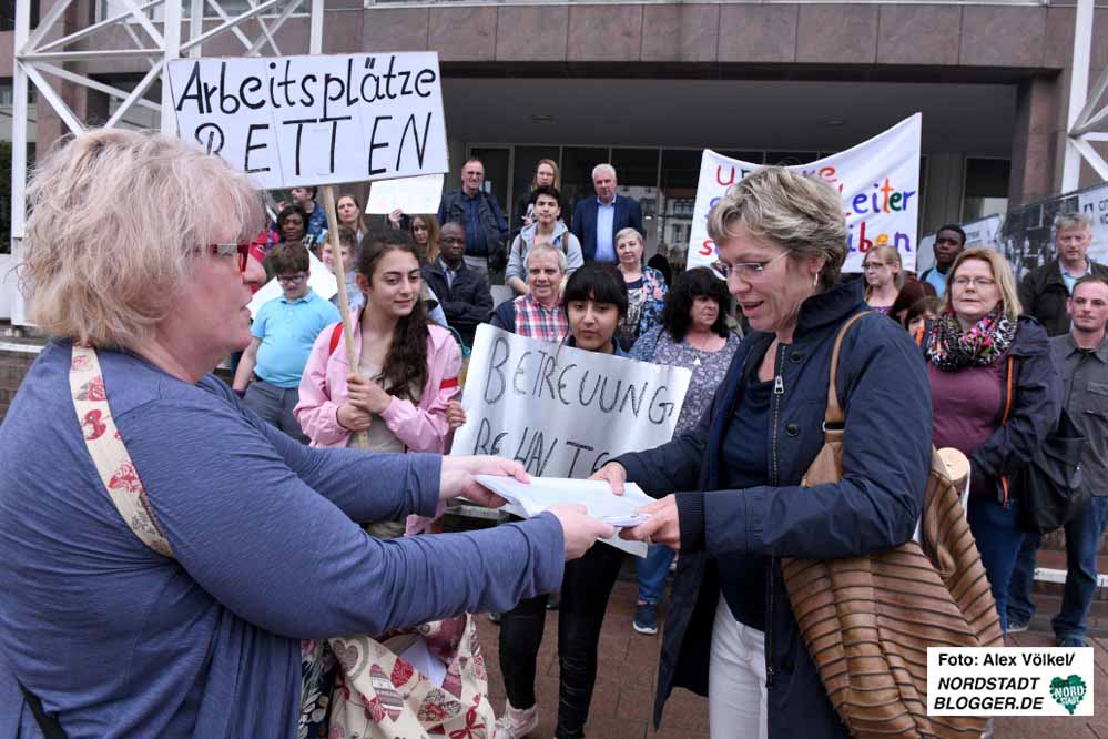 Die Grünen-Politikerin musste sich viel Kritik von Eltern und Beschäftigten anhören. Denn diese machten ihrem Frust Luft, dass gut ausgebildete Kräfte nun auf der Straße stehen oder zu deutlich geringeren Löhnen für dieselbe Arbeit bei einem anderen Träger anfangen sollen.