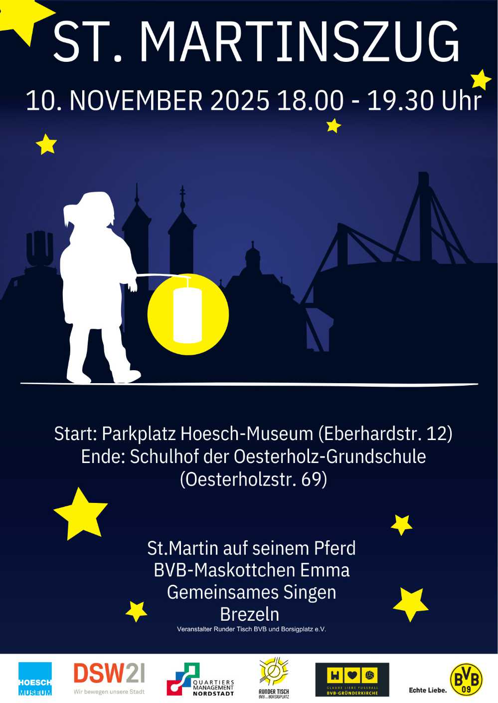 Das Borsigplatzquartier wird am 10. November 2025 wieder vom Schein der Martinslaternen erhellt. Der traditionelle schwarzgelbe Martinszug startet auf dem Parkplatz des Hoeschmuseums von dort führt Martin auf dem Pferd die Kinder, begleitet von Blasmusik, durch das Viertel.