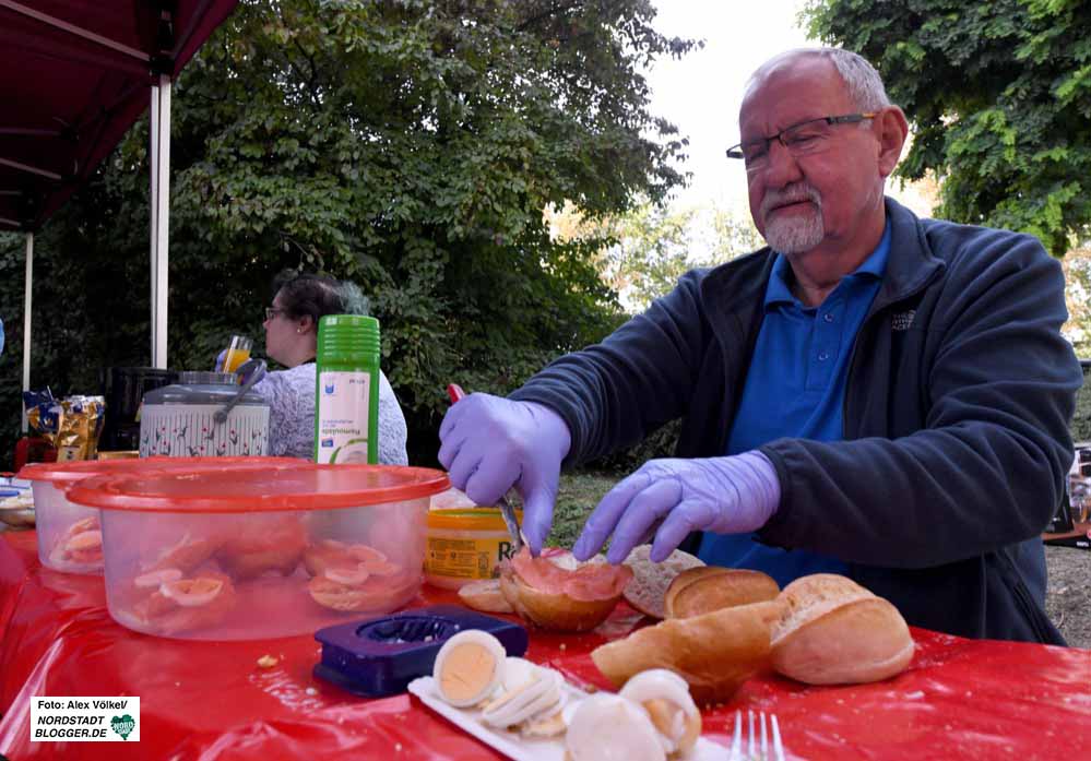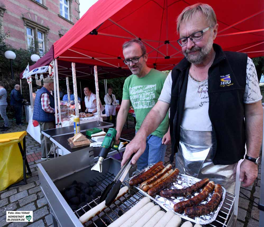 Mitglieder der Nordstadt-SPD und -CDU belegen die Fischbrötchen und lassen die Sektkorken knallen