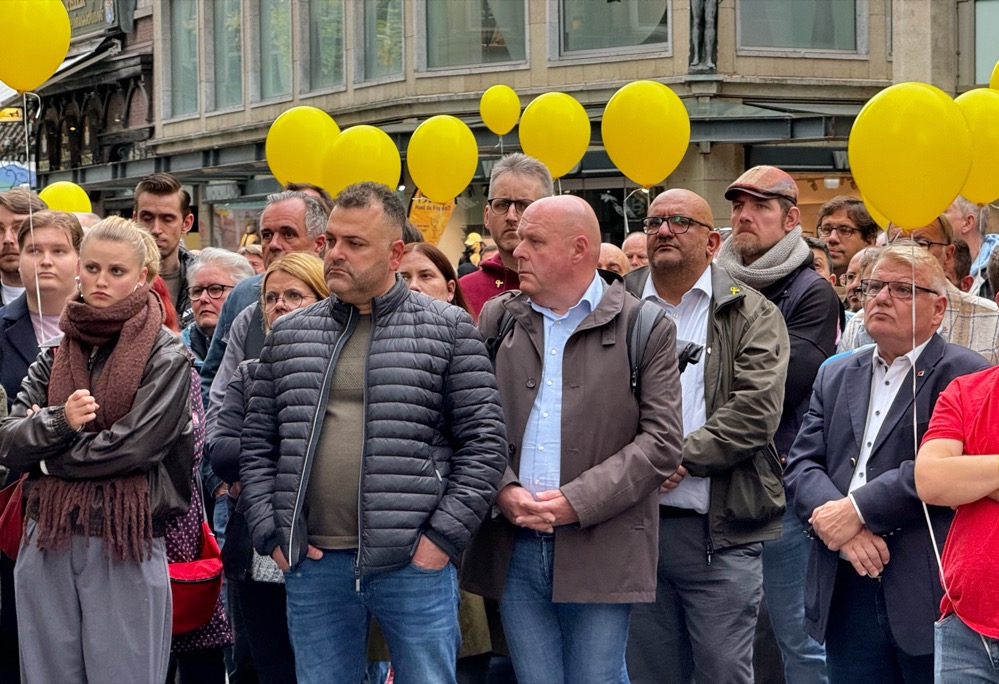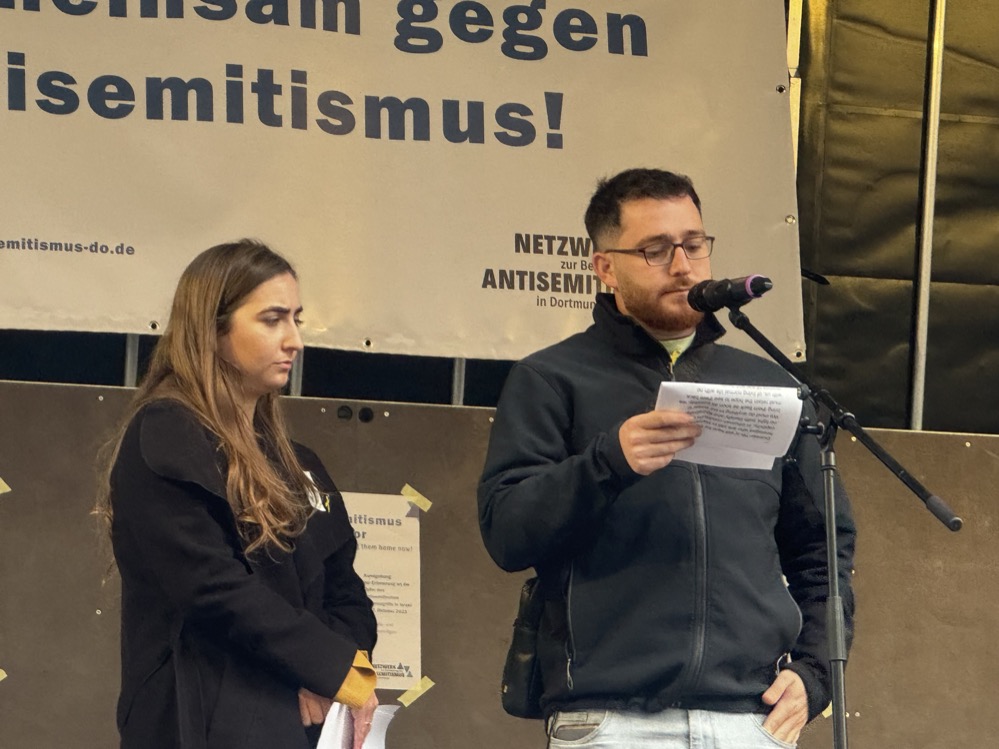 Mit einer Schweigeminute für die brutal ermordeten Israelis und für die immer noch in Gefangenschaft der terroristischen Hamas festgehaltenen Geiseln eröffnete Jacob Liedtke von der Faninitiative „ballspiel.vereint!“ die gestrige Gedenkveranstaltung in der Dortmunder City am Montagabend.