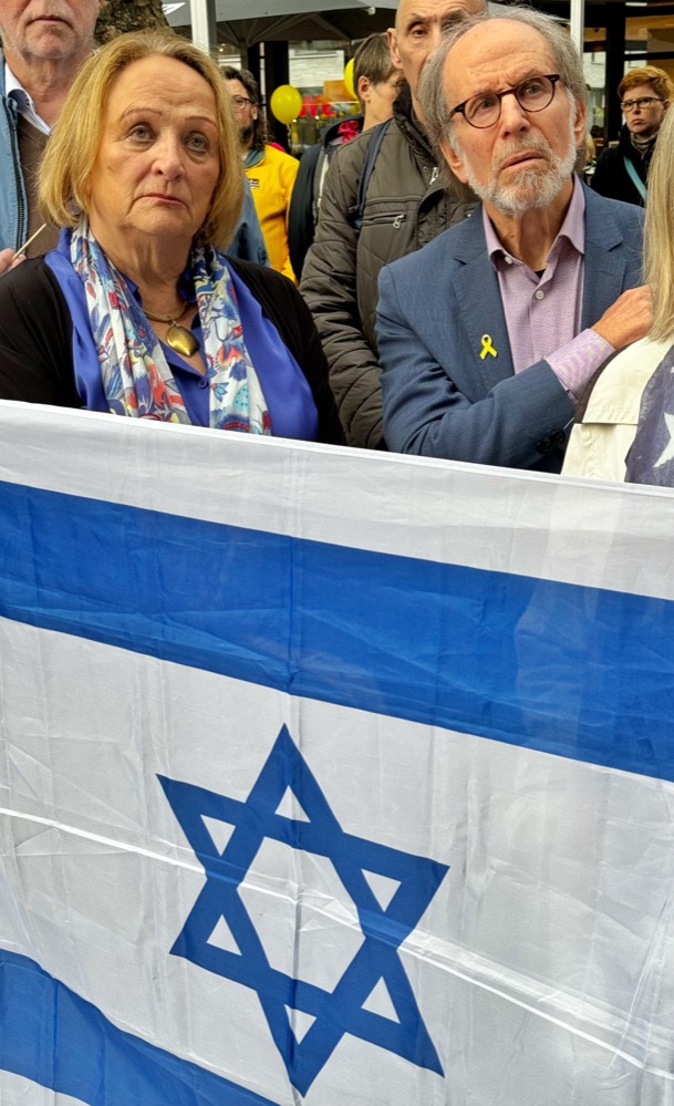 Extra angereist für die Gedenkveranstaltung waren zwei Israelische Überlebende des 7. Oktobers. Ihr Zuhause, das Kibbuz Nachal Oz, war auch überfallen worden. „Es war 10 Uhr morgens und wir haben begriffen, dass die Hamas-Terroristen bald an unserem Haus ankommen würden und niemand da sein würde, um uns zu retten. Wir hätten an diesem Tag für ein entspanntes Wochenende und einen Feiertag aufwachen sollen. Stattdessen sind wir um 6:28 Uhr vom Geräusch von Sirenen und der terroristischen Angriffe wach geworden“, sagten sie auf der Bühne.