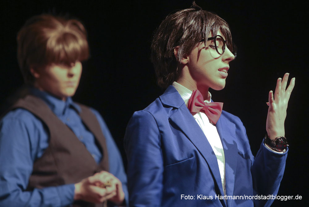 Im Garten ist Foto-Session angesagt. Der Herbstlaub bietet zudem eine schöne Kulisse. Die beiden jungen Frauen, die sich als dramatical Murder vorstellen, geben dem Fotografen einen freundlichen Hinweis. „Versuch es doch mal aus leichter Draufsicht, das sieht meistens besser aus“. Stimmt!
