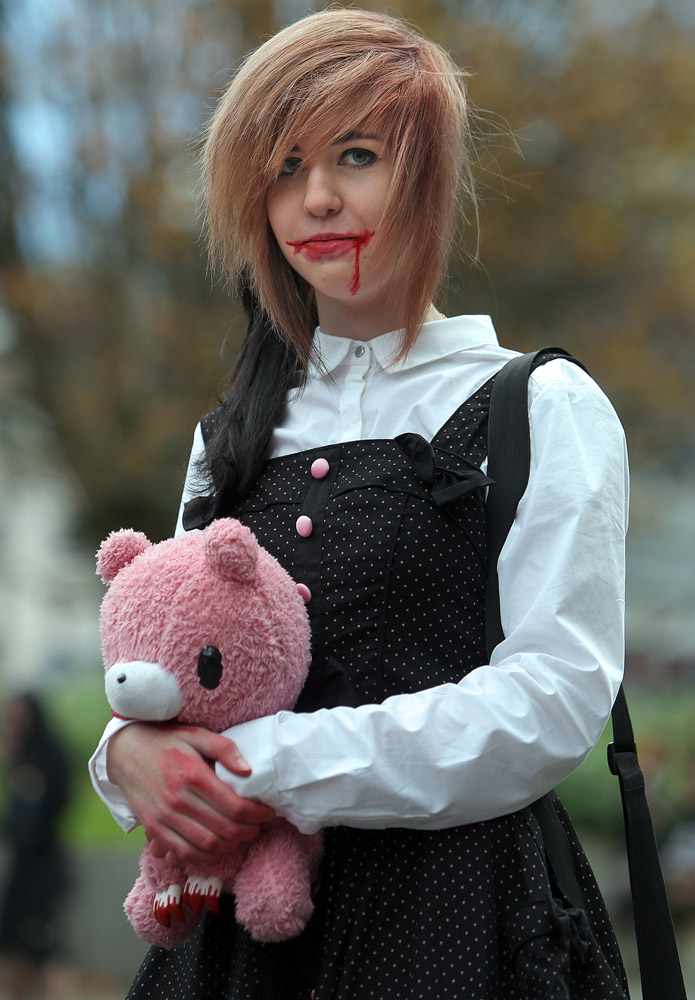 Ein paar Meter weiter steht Slit-mouthed-woman. Die junge Frau macht eigentlich eine sympathischen Eindruck, wären da nicht die aufgeschlitzten Mundwinkel in ihrem Gesicht und das ramponierte Teddybärchen das von einer abgetrennten blutigen Hand aus Plastik getätschelt wird.