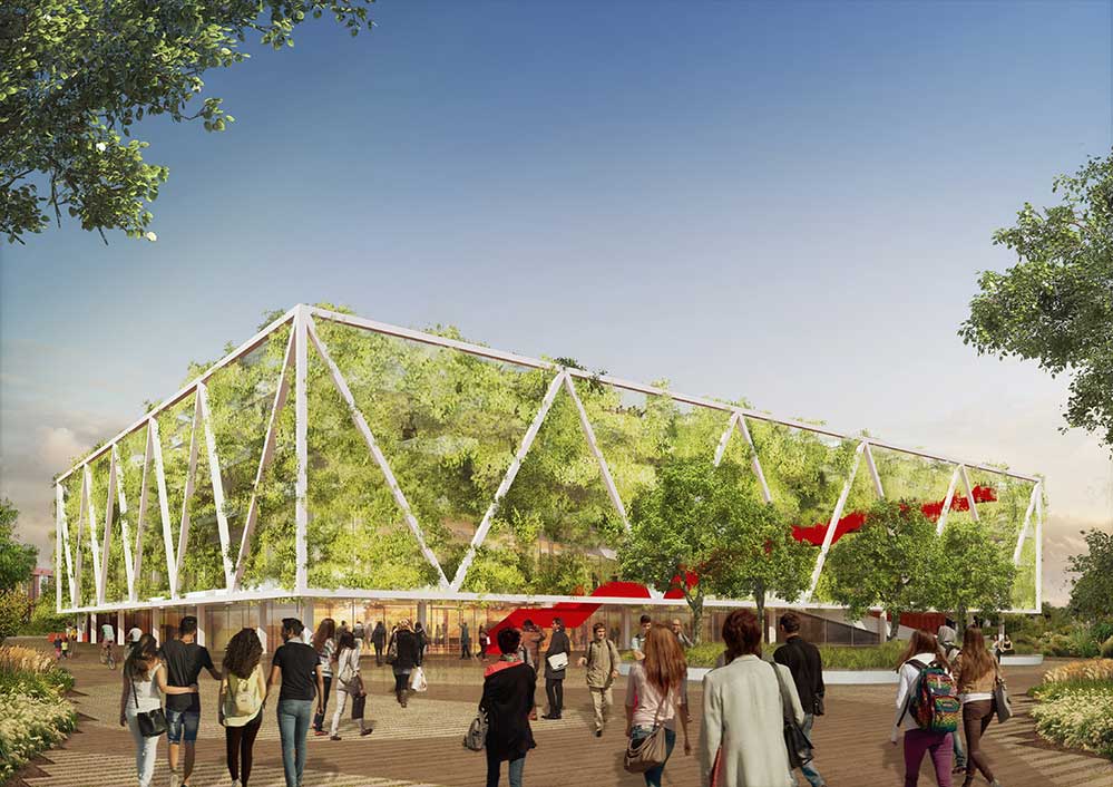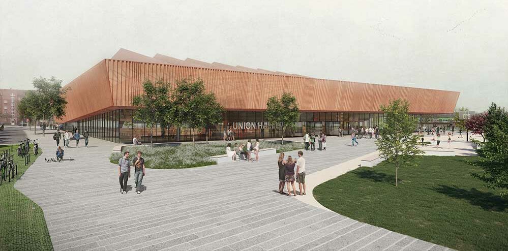 Nachdem das Robert-Schuman-Berufskolleg und das Robert-Bosch-Berufskolleg rund um den U-Turn ihren Betrieb aufgenommen haben, werden nun auch die erforderlichen Sporthalleneinheiten für den Schulbetrieb geschaffen. Die Stadt Dortmund beabsichtigt eine Vierfachsporthalle auf einer aktuell als Parkplatz genutzten Freifläche an der Übelgönne/Unionstraße zu errichten. Das Vorhaben rundet die städtebauliche Entwicklung des Stadtumbaugebiets Rheinische Straße ab, durch die insbesondere die Flächen rund um den U-Turm als Eingangsbereich ins Unionviertel neu strukturiert und aufgewertet wurden.