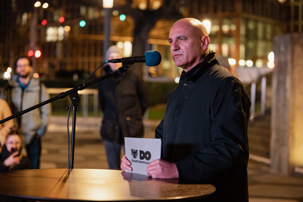 Im Anschluss sprach der Rabbiner der Dortmunder Gemeinde, Avigdor Moshe Nosikov. Er richtete lediglich eine Frage an die politischen Entscheidungsträger:innen – in Dortmund, in Deutschland und weltweit. „Wollen Sie auf der hellen Seite oder auf der dunklen Seite der Geschichte stehen?“, fragte er und war sichtlich erschüttert.