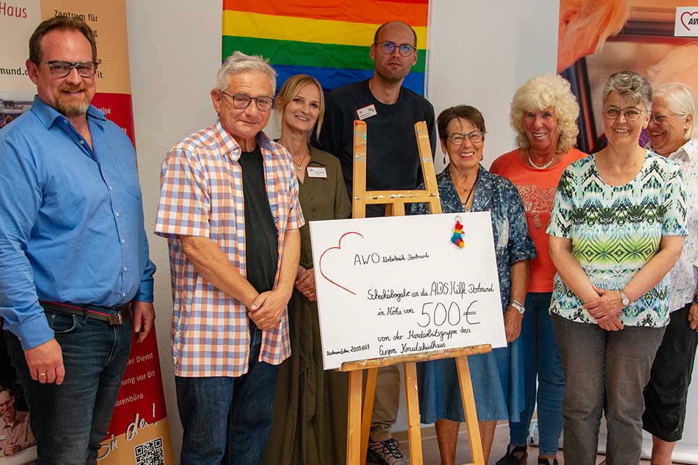 Der Handarbeitsgruppe des durch die AWO Dortmund geführten Eugen-Krautscheid-Hauses war es eine Herzensangelegenheit, sich mit einer Aktion am diesjährigen CSD aktiv zu beteiligen. Nach kurzer Überlegung war die Idee geboren, kleine Regenbogen-Socken in Handarbeit zu fertigen und diese einzeln als Schlüsselanhänger gegen eine Spende für die Dortmunder Aidshilfe zu veräußern. Entstanden sind dabei fantastische Unikate. Insgesamt waren es 75 Stück, wobei pro Söckchen rund eine Stunde ehrenamtliche Arbeit investiert wurde. Alle Socken waren binnen kurzer Zeit vergeben und schmücken nun so manchen Schlüsselbund in Dortmunder Taschen. Großartige 500,— Euro konnten so zusammengetragen werden.