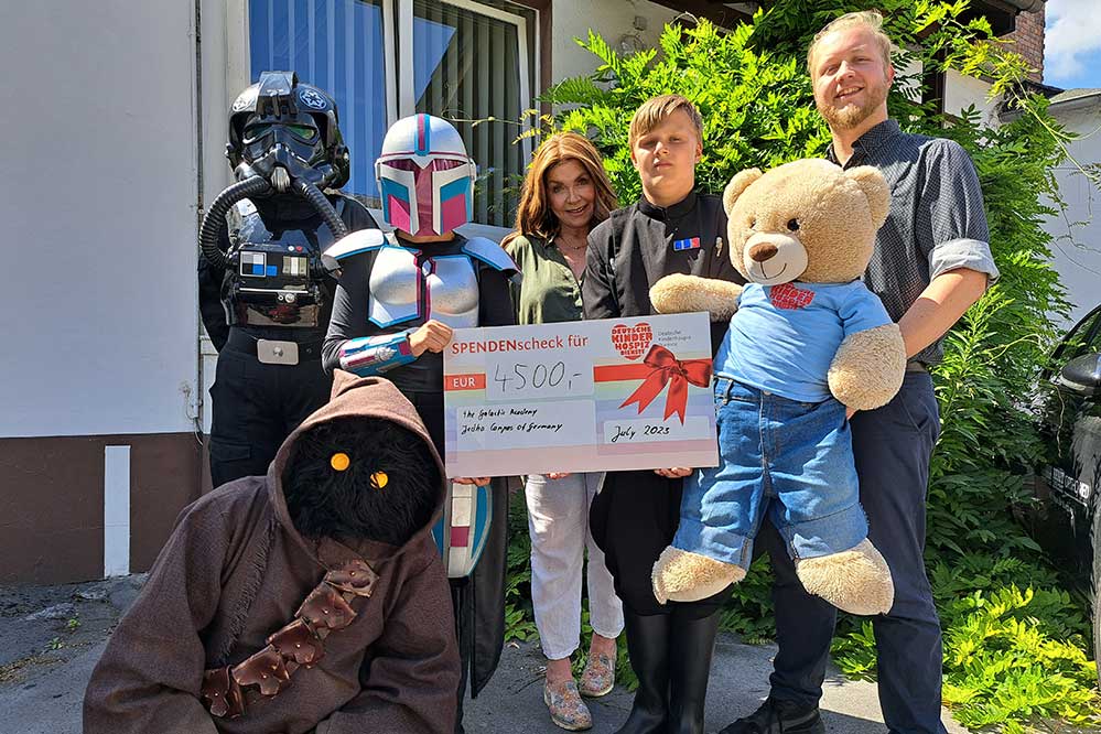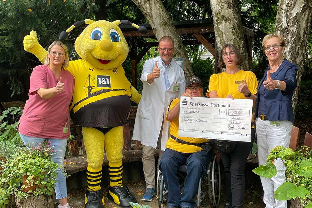 Bildzeile: v.l. Svenja Rochel (Kinderglückinsel), Emma (BVB), Prof. Dr. Dominik Schneider (Direktor der Kinderklinik), Dirk Meiske, Corinna Giesler (Freundin von Meiske), Barbara Drewes (Fundraising)
