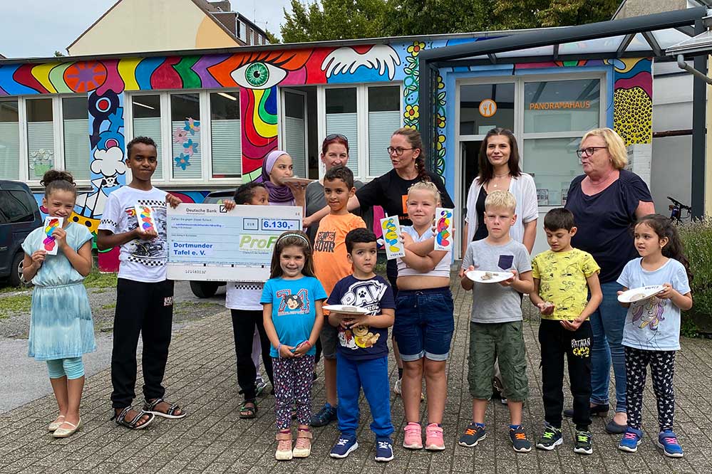 Bildzeile: v.l. Jessica Böhm (Regenbogenhaus e. V.), Isabella Thiel (Dortmunder Tafel), Svenja Felbier (Projektbetreuung ProFiliis-Stiftung), Regina Grabe (2. Vorstandsvorsitzende Dortmunder Tafel) sowie Kinder von Tafelkund:innen, die das Angebot nutzen.