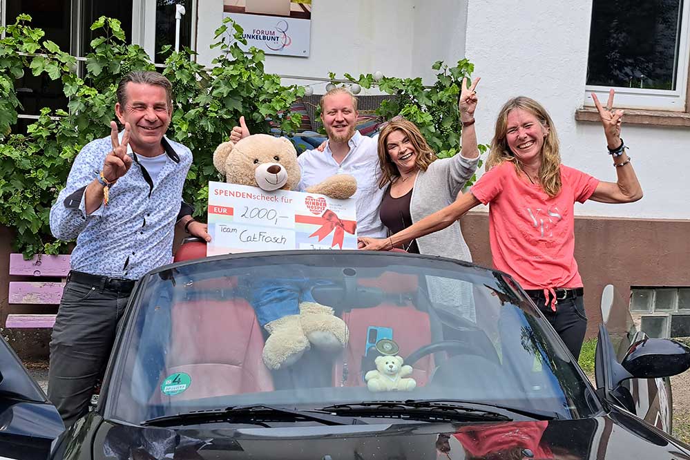 Bildzeile: Mit Spenden in Höhe von 2000 Euro zurück in Dortmund: Glücklich und stolz übergab das „CatFrosch“-Rallye-Team alias Frank (links) und Claudia Schulz (rechts) seine Spende mit einem symbolischen Scheck an Birgit Lindstedt (2. von rechts) und Michael Cremann (hinten) aus dem DKD-Team und natürlich an Bärenbotschafter Hope, der als kleiner Glücksbringer bei der gesamten Tour durch Europa auf dem Armaturenbrett mitfahren durfte.