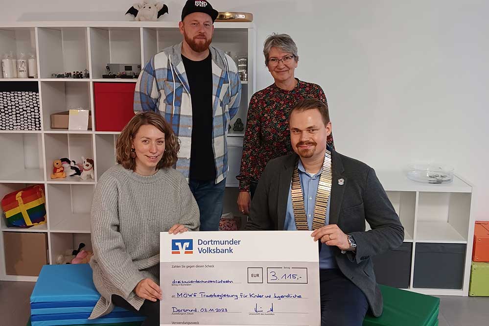 Und diese Teilnehmer spendeten kräftig. So kamen 3.115 Euro zusammen, die Daniel Duus und Christopher von Wontoch im Namen des Round Table 115 in der Hörder Rathausstraße jetzt bei der MÖWE Trauerbegleitung für Kinder und Jugendliche mit einem symbolischen Scheck überreichten. Beate Schwedler (Projektleitung) und Katrin Riebling (Pädagogische Leitung) freuten sich sehr.