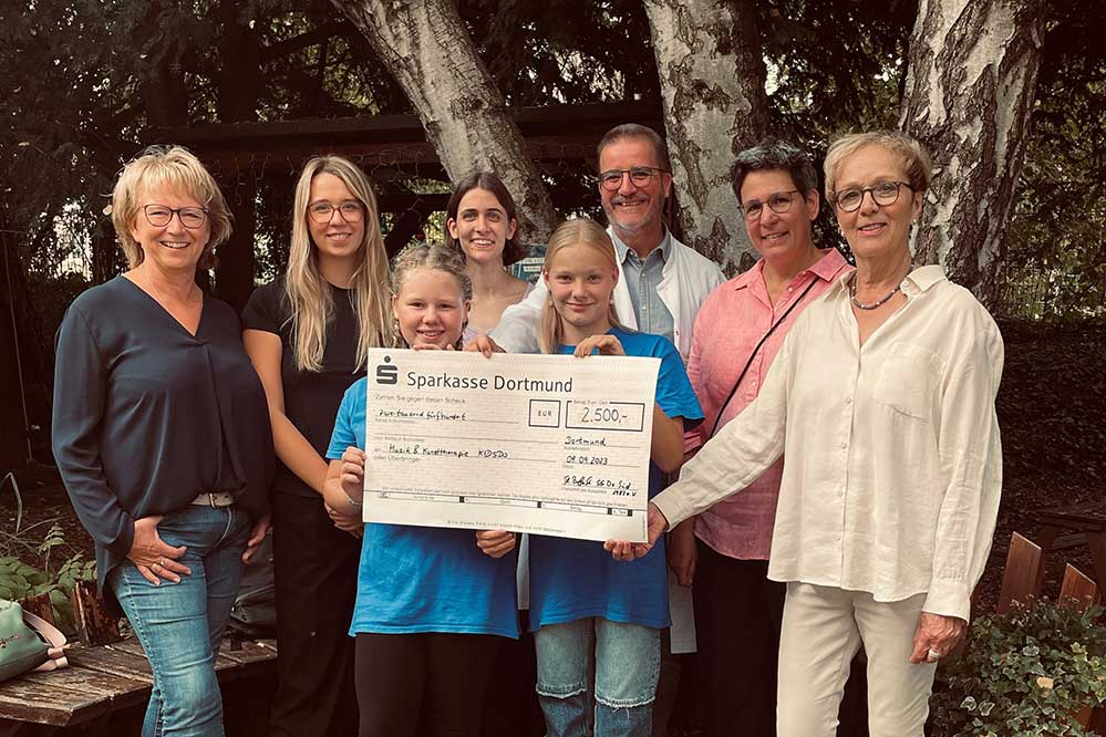 Die Schwimmgemeinschaft (SG) Dortmund-Süd hat zu ihrem 40-jährigen Bestehen ein Sponsorenschwimmen veranstaltet, um Spenden für die Musik- und Kunsttherapie des Westfälischen Kinderzentrums des Klinikums Dortmund zu sammeln. 43 Teilnehmerinnen und Teilnehmer absolvierten insgesamt 7.905 Bahnen für den guten Zweck und brachten damit die Summe von 2.500 Euro zusammen. Am Montag (2.10.) übergaben Vertreterinnen und Vertreter des Vereins im Therapiegarten des Westfälischen Kinderzentrums die Spende an Prof. Dr. Dominik Schneider, Direktor der Klinik für Kinder- und Jugendmedizin.