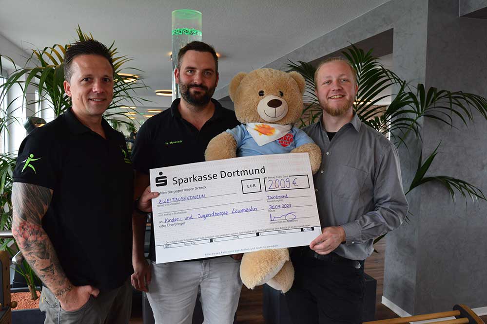 Bartosz Mlynarczyk (Foto Mitte) und Timo Stickeln (Foto links) sind Physiotherapeuten aus Leidenschaft und Geschäftspartner. Im Frühjahr haben die beiden ihr Gesundheitsstudio in Dortmund-Hombruch neu eröffnet und die Fläche vergrößert. Etliche Besucherinnen und Besucher kamen an einem Wochenende Ende April zu dem sportlichen Gesundheitsevent, informierten sich, aßen und tranken und spendeten fleißig. Die beiden Geschäftsführer des Hombrucher Physiotherapeuten-Teams hatten sich im Vorfeld überlegt, den Ambulanten Kinder- und Jugendhospizdienst Löwenzahn Dortmund mit ihrer Spende zu unterstützten und waren genauso wie Michael Cremann aus dem Löwenzahn-Fundraising-Team und Bärenbotschafter Hope überrascht, wieviel Geld in den aufgestellten Spendenboxen gelandet war: 2009 Euro, die die Studio-Inhaber Mlynarczyk und Stickeln mit einem symbolischen Spendenscheck überreichten.