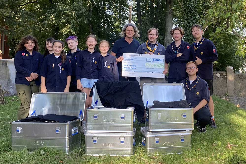 Bildzeile: Der Scheck wird übergeben von Thomas Schieferstein (links am Scheck, Vorstand ProFiliis-Stiftung) an Dominik Zorn (rechts am Scheck, Stamm Weiße Rose) sowie Pfadfinderinnen und Pfadfinder.