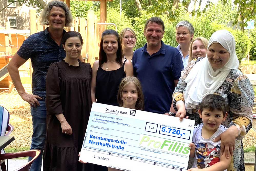 Bildzeile: v.l. Thomas Schieferstein (Vorstand ProFiliis), Jalila Chaou (Beraterin Beratungsstelle Westhoffstraße), Svenja Felbier (Projektmanagement ProFiliis), Helene Kösters (Praktikantin Beratungsstelle Westhoffstraße),), Thorsten Szelies (Berater Beratungsstelle Westhoffstraße),), Maria Preuß (Fachbereichsleiterin Beratungsstelle Westhoffstraße), Silva Kreitschmann (Beratungsstelle Westhoffstraße) und Besucher:innen des Familientreffs Westhoffstraße.