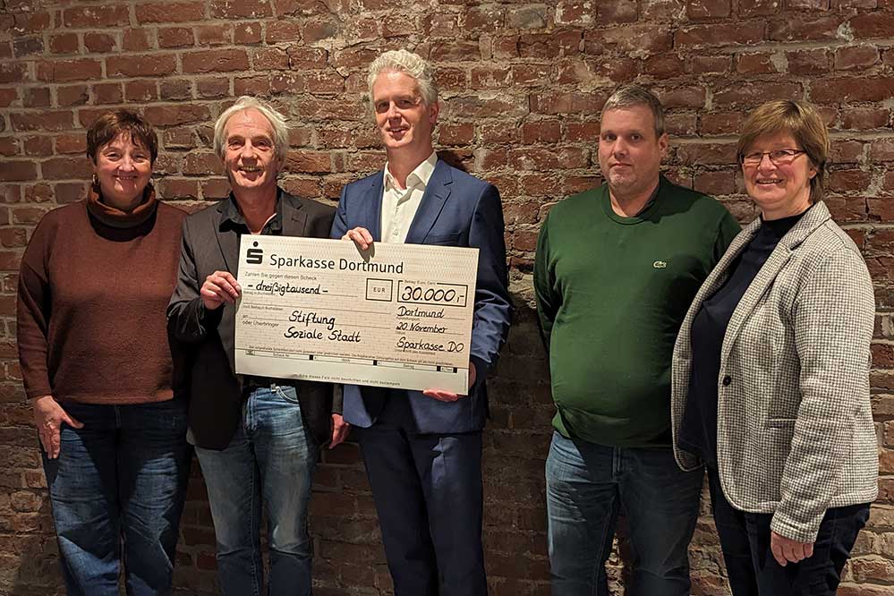Bildzeile: v.l. Ute Lohde, Vorstand Stiftung soziale Stadt; Andreas Koch, Vorstandsvorsitzender Stiftung soziale Stadt; Björn Wiggers, Bereichsleiter Vorstandsstab der Sparkasse Dortmund; Björn Schroer, Vorstand Stiftung soziale Stadt; Anja Coumans, Vorstand Stiftung soziale Stadt.