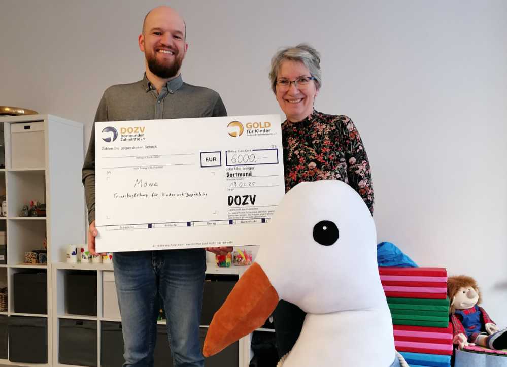 „Eine tolle Initiative, sehr unterstützenswert“ – mit diesem Fazit endete der Besuch von Lukas Lehrich im Kindertrauerzentrum MÖWE. Er überreichte einen symbolischen Scheck mit 6.000 Euro der Dortmunder Zahnärzte helfen e.V., die alljährlich Gold für Kinder sammeln. Lukas Lehrich hat den Vorsitz der Dortmunder Zahnärzte helfen e.V. von Dr. Joachim Otto übernommen. Einiges soll sich ändern, denn Zahngold wird perspektivisch weniger. Das soziale Engagement soll aber nicht nachlassen und durch moderne Medien unterstützt werden.