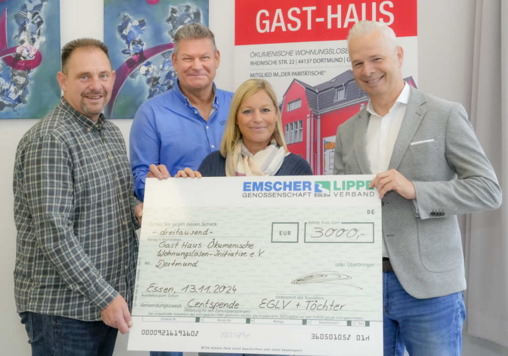 Wenn viele Menschen zusammenarbeiten, entsteht aus kleinen Beiträgen schnell Großes – das zeigt auch die Centspende von Emschergenossenschaft/Lippeverband (EGLV) sowie ihrer Tochtergesellschaften Betrem GmbH, Innovatherm GmbH, Emscher Wassertechnik GmbH sowie Lippe Wassertechnik GmbH. Durch eine kleine monatliche Spende sammelten die Mitarbeitenden im vergangenen Jahr insgesamt 12.000 Euro für den guten Zweck. Vier gemeinnützige Institutionen aus Dortmund, Essen, Bottrop und Datteln dürfen sich jeweils über einen Scheck in Höhe von 3.000 Euro freuen. Eine davon ist „Gast-Haus e. V.“ in Dortmund. Bei der Centspende verzichten die teilnehmenden Mitarbeiter*innen bei der monatlichen Gehaltszahlung auf die Centbeträge hinter dem Komma und geben diese in einen separaten Spendentopf. Dieser wird einmal im Jahr für gemeinnützige Institutionen ausgeschüttet. Mehr als 1.152 Beschäftigte bei EGLV sowie den Töchtern nehmen an dieser Spendenaktion teil.
