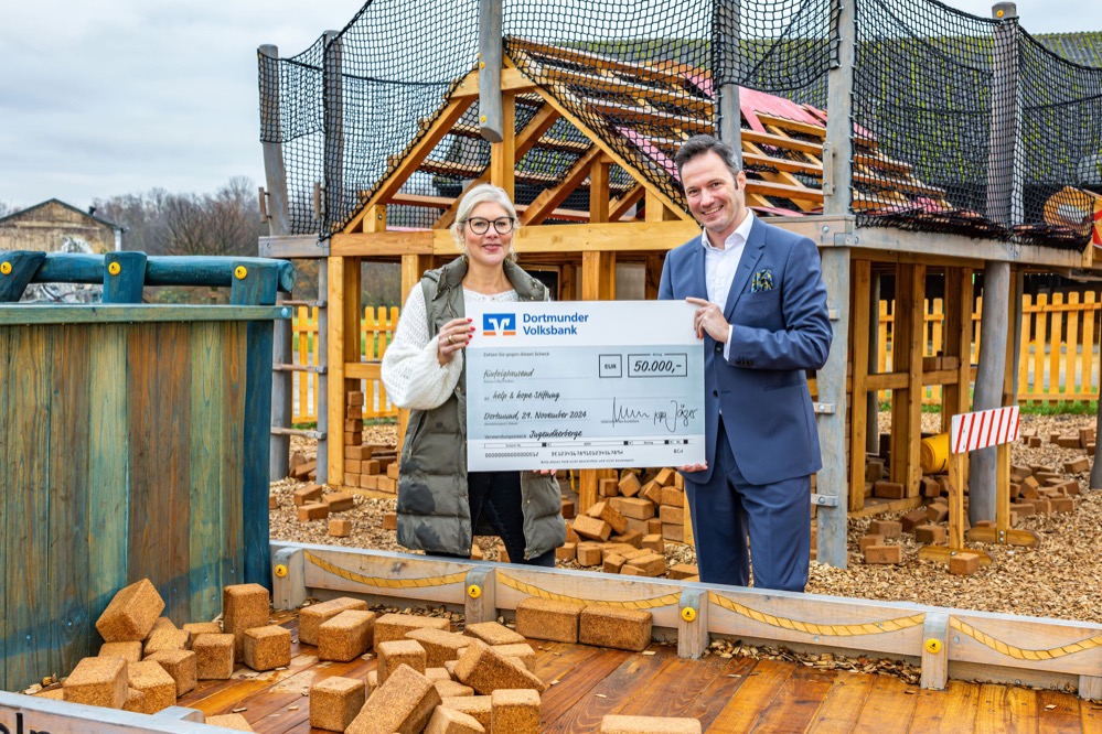 Die Dortmunder Volksbank hat 50.000 Euro an die „help and hope“-Stiftung gespendet. Damit unterstützt das genossenschaftliche Institut die Stiftung beim Neubau einer Übernachtungsmöglichkeit auf Gut Königsmühle in Dortmund-Mengede. Das ambitionierte Vorhaben sieht die Schaffung einer barrierefreien Herberge für Kinder und Jugendliche vor. Ab 2026 soll sie Platz für bis zu 100 junge Menschen bieten. Geplant ist die Herberge als „inklusiver Rückzugsort“ auf dem zwölf Hektar großen Gelände, das durch Wald-, Wiesen- und Weideflächen dominiert wird. Kinder und Jugendliche bekommen hier Raum für Abenteuer, Kreativität und gemeinsames Lernen. Besonders im Fokus der Stiftungsarbeit stehen junge Menschen mit besonderen Herausforderungen.