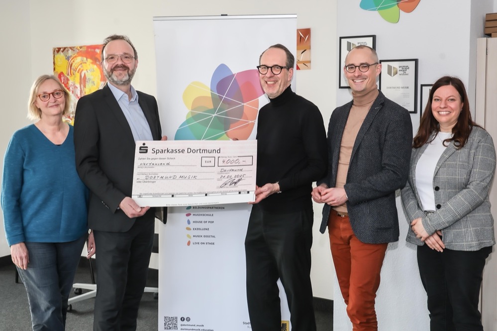 Jürgen Wallinda-Zilla, Präsident des Lions-Club Dortmund-Rothe Erde (3. v. l.), und Gregor Boldt, Veranstaltungsvorstand beim Lions-Club Dortmund-Rothe Erde (4. v. l.), überreichten einen symbolischen Spendenscheck in Höhe von 4.000 Euro an Stefan Prophet, Direktor von DORTMUND MUSIK (2. v. l.), Christine Hartmann-Hilter, stellvertretende Direktorin (l.), und Sarah Säftel, Fachleitung für Blasinstrumente von DORTMUND MUSIK. Die Spende stammt aus der Benefizveranstaltung „Swing am Sonntag @Kokerei“, die der Club im September 2024 erstmals organisiert hatte.