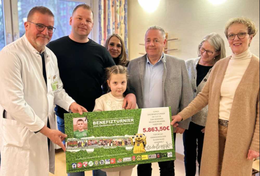 David Neumann aus Halver verstarb im vergangenen Jahr im Alter von nur 13 Jahren an den Folgen einer Leukämie-Erkrankung. Trotz seiner Krankheit spielte er mit Leidenschaft Fußball und genoss großen Respekt als Teamplayer bei seinen Mitspielern und Trainern. Aufgrund seiner Erkrankung verbrachte David eine lange Zeit in stationärer Behandlung in der Kinderklinik des Klinikums Dortmund. In diesem Jahr organisierten seine Eltern zusammen mit Vertretern seines Vereins TuS Grünenbaum ein Benefizturnier. Ziel war es, Spenden für die onkologische Abteilung der Kinderklinik zu sammeln. Die Initiative war äußerst erfolgreich: Insgesamt 5.863,50 Euro konnten Davids Eltern und sein Trainer an Prof. Dr. Dominik Schneider, Direktor der Klinik für Kinder- und Jugendmedizin, sowie Fundraising-Leiterin Barbara Drewes jetzt überreichen. Die Summe unterstützt im Westfälischen Kinderzentrum verschiedene Angebote, die den jungen Patientinnen und Patienten kostenfrei zur Verfügung stehen und die daher auf Spenden angewiesen sind. Dazu gehören unter anderem Musik- und Kunsttherapien, die es den Kindern ermöglichen, ihre Gedanken auf kreative Weise auszudrücken, sei es durch das Spielen eines Instruments oder das Malen eines Bildes. Auch die Besuche der Clowns, die den Kindern freudige Momente während ihres Klinikaufenthalts bereiten, werden durch Spenden finanziert.